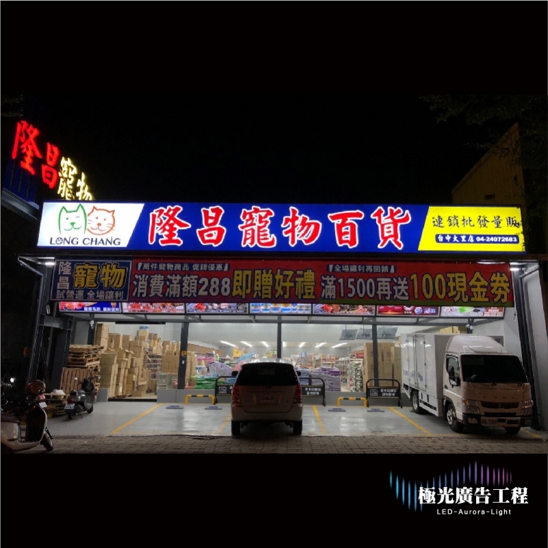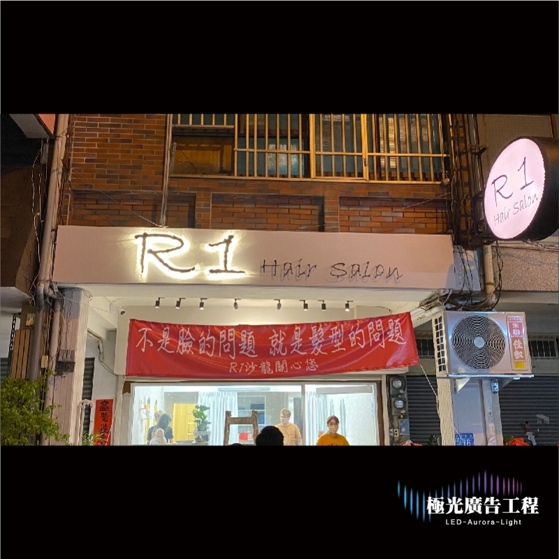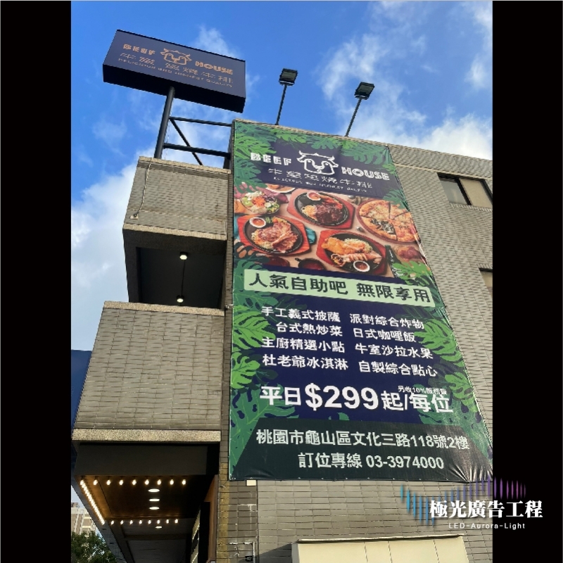 製作項目: ▲無接縫招牌 ▲招牌燈箱 ▲牆面大圖輸出 ▲燈殼發光字 ▲帆布
